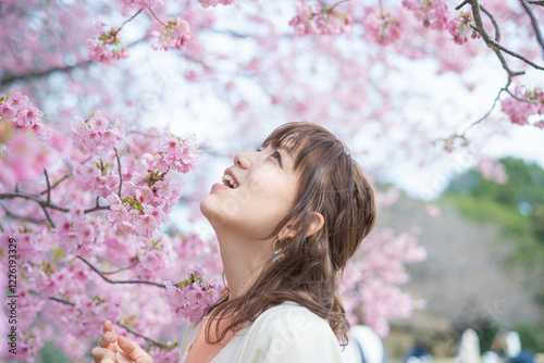© TAGSTOCK2, Fototapeta premium 桜の花を楽しむ女性