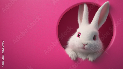 Obraz premium ピンク背景から顔を出す白いウサギ