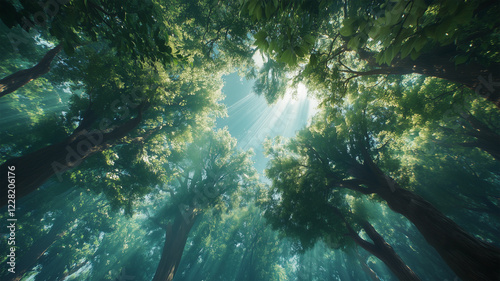 © bephoto, Fototapeta premium ジャングルの木々を見上げる冒険心あふれるローアングル