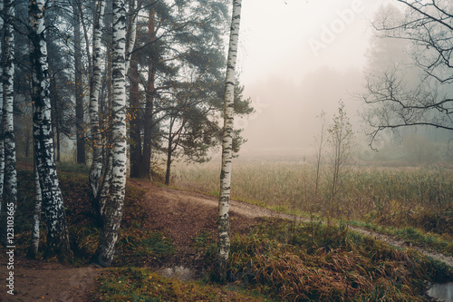 Obraz premium Берег озера заросший травой и камышами в утреннем туманном осеннем лесу