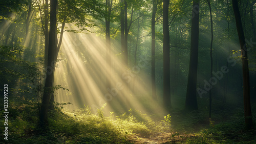 © bephoto, Obraz premium 光芒に包まれる森 – 朝日の輝きが描く神秘の世界