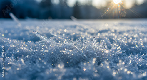 Fototapeta premium 차가운 바닥에 쌓여있는 하늘빛깔이 감도는 흰색의 눈 결정이 뽀족하고 세밀하게 보이는 겨울 풍경 배경 노을 햇살 나무 자연 밖 실외 사진