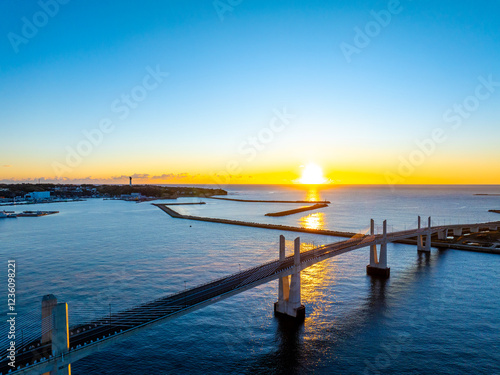 Obraz premium 夜明けの小名浜港・小名浜マリンブリッジ(福島県いわき市)