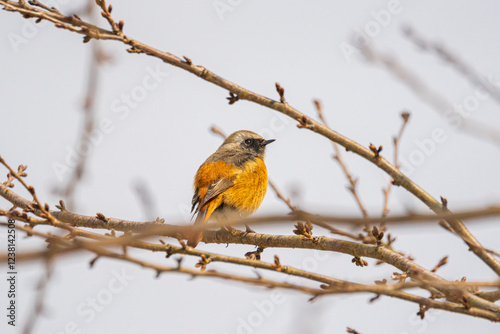 Fototapeta premium 冬枯れの枝にとまり朝日を浴びるジョウビタキ