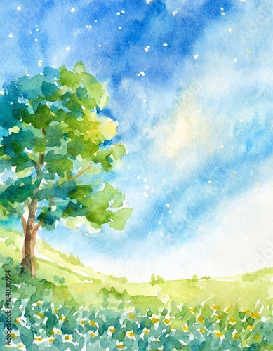 © Bambi and Sunny, Obraz premium 癒しの木の水彩画イラスト