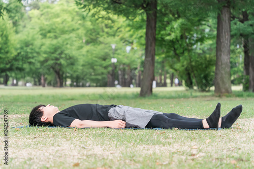 Fototapeta premium 公園でヨガマットをひいてヨガ・ピラティスをする若い男性
