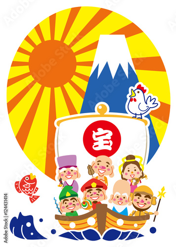 Obraz premium 酉年 めで鯛 七福神の宝船と富士山
