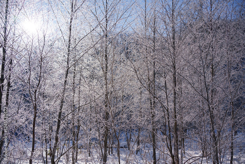 Fototapeta premium 北海道恵庭市 冬の朝日と輝く樹氷