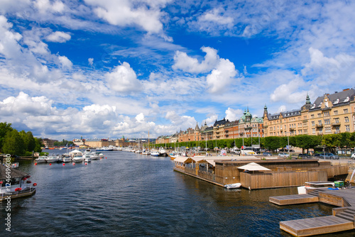 Obraz premium スウェーデン ストックホルムの湖と街並み、ユールゴーデン橋から
