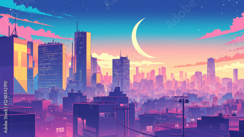 © 963k, Fototapeta premium レトロフューチャーな街並み 夢幻の色彩に染まる高層ビル群