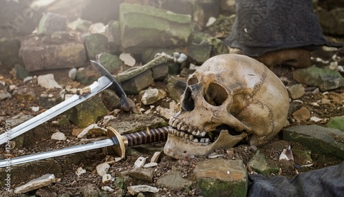 © 순단 강, Fototapeta premium 고대 전장의 잔해 속, 부러진 검과 갑옷 조각 사이에 놓인 해골