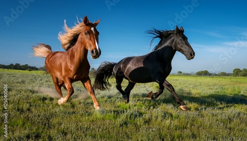 Obraz premium 青空の下、緑の草原を駆け抜ける美しい2頭の馬 - 自然の躍動感と自由を感じる瞬間