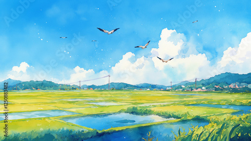 © 963k, Obraz premium のどかな農村風景|山々と広がる田んぼ、穏やかな自然の景色
