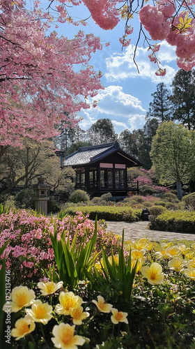 © 963k, Obraz premium 和風ガーデンの絶景|春爛漫の桜と美しい庭園の小道。スマートフォン9:16のアスペクト比