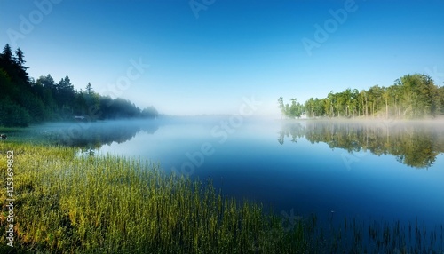 © 貴宏 西山, Fototapeta premium 穏やかな湖畔 朝もやが漂う湖とその反射。シンプルな背景部分がコピースペースとして働き、落ち着いたデザインに最適。