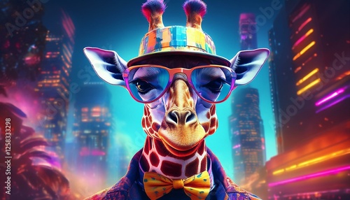 Fototapeta premium 未来派デジタルキリン 概要- 未来的な都市背景やホログラムのエフェクトをバックに、スリムで洗練されたキリンが、モダンなデザインのハット、デジタル風サングラス