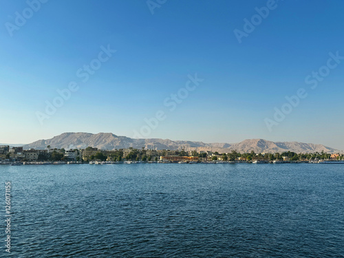 © elico-polo, Fototapeta premium ナイル川東岸から見たルクソール西岸の風景、東南から見た王家の谷のある丘