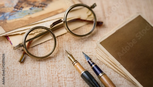 Fototapeta premium 빈티지 우편 엽서와 함께 올려진 둥근 안경, 클래식한 만년필