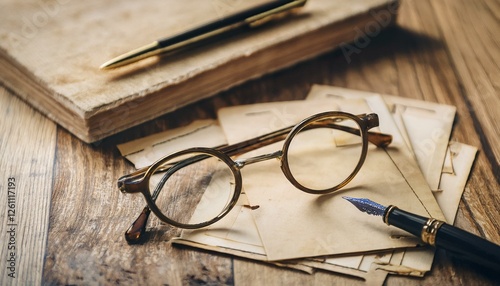 Fototapeta premium 빈티지 우편 엽서와 함께 올려진 둥근 안경, 클래식한 만년필
