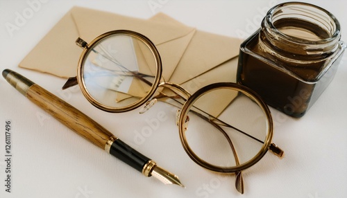 © 수진 우, Fototapeta premium 빈티지 우편 엽서와 함께 올려진 둥근 안경, 클래식한 만년필