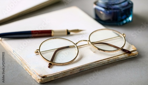 © 수진 우, Fototapeta premium 빈티지 우편 엽서와 함께 올려진 둥근 안경, 클래식한 만년필