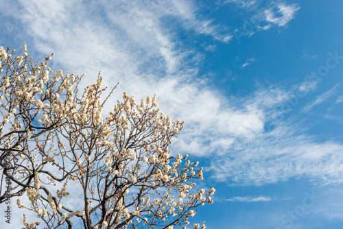 Obraz premium 早春に咲いた梅の花と木、日本庭園の梅林