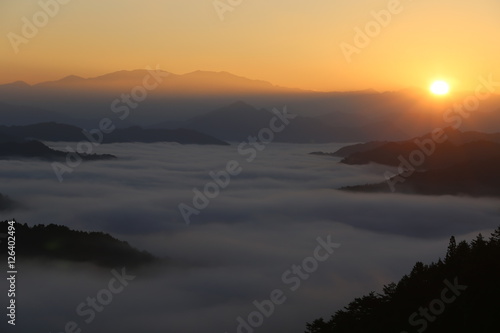 Obraz premium 野迫川村の雲海と朝焼け