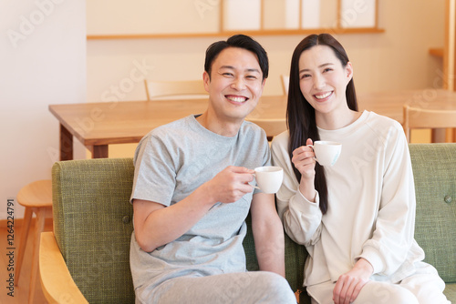 Fototapeta premium 朝起きてリビングでコーヒーを飲む夫婦