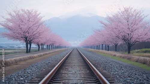 Fototapeta premium 日本の田園風景に続く桜並木と線路、ミニマルな美しさ