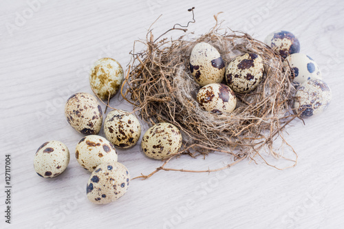 Obraz premium Перепелиные яйца в птичьем гнезде и на деревянном столе