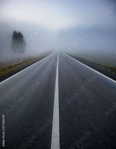 © EASY103, Fototapeta premium 霧の中に包まれた空っぽの道路のぼんやりとした景色