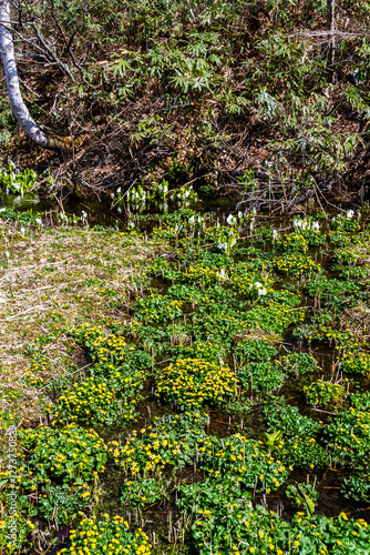 © naomi sugitani, Fototapeta premium (岐阜県飛騨の自然)飛騨市 池之原湿原の水芭蕉、リュウキンカ 5月