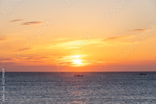 Naklejka premium オレンジ色に朝焼けする空と海