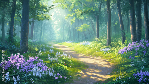 Obraz premium 紫の野花が咲く森の小道