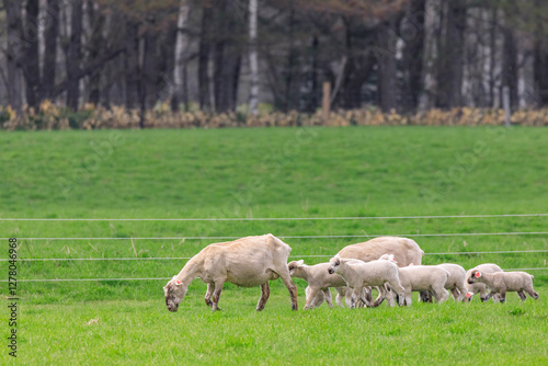Obraz premium 北海道占冠村、お散歩する羊の親子【5月】