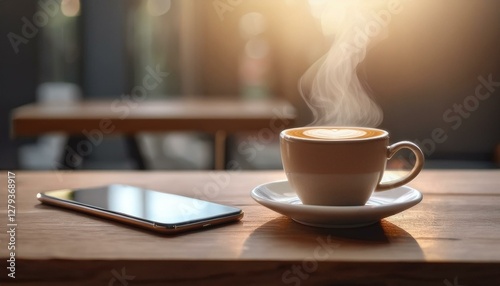 © 순단 강, Obraz premium 카페 테이블에 스마트폰이 올려져 있고 옆에는 카페라떼 한 잔이 놓여져있다