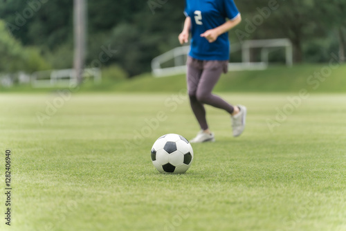 © buritora, Obraz premium サッカー場でユニフォームを着てサッカー・フットサルの練習をする日本人女性