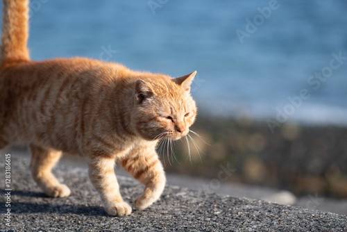 Obraz premium 堤防を歩く可愛い猫 茶トラ猫