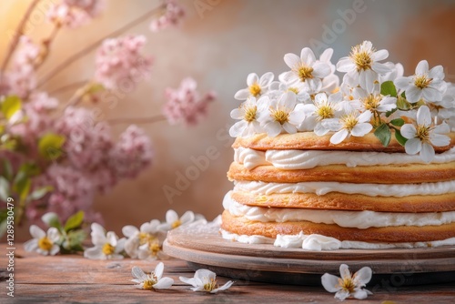 © pham, Fototapeta premium 春の花が彩るクリームケーキの美しさとテーブルセッティング