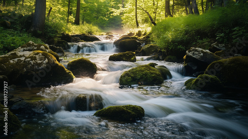 © bephoto, Obraz premium 渓流のせせらぎ – 滑らかに流れる水と自然の調和