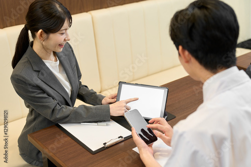 © mapo, Fototapeta premium デジタルツールの営業をするビジネスウーマン