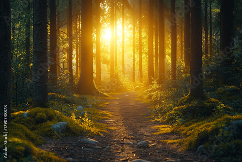 © 호롱 애플, Obraz premium 신비로운 아침 햇살이 비추는 숲속 산책길