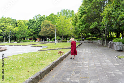 © sorakun, Fototapeta premium 緑のある公園 夏の日の公園での、犬の散歩 ペットとお出かけ リードを持つ手 緑の風景