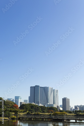 Obraz premium 東京都市風景 浜離宮 庭園 秋 紅葉と晴海の高層マンション群