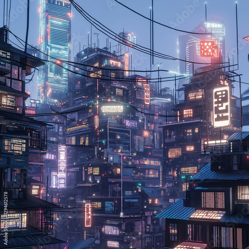 © Mirecat, Obraz premium アジアファンタジー。電線が張り巡らせた街