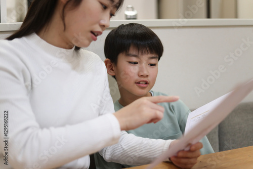 © yamasan, Fototapeta premium 通知表を見て困った顔の母親