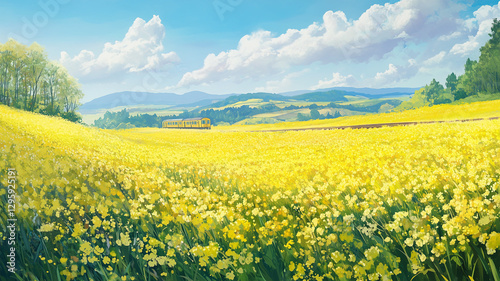 © bephoto, Obraz premium 菜の花畑を横切るローカル線と春の旅情