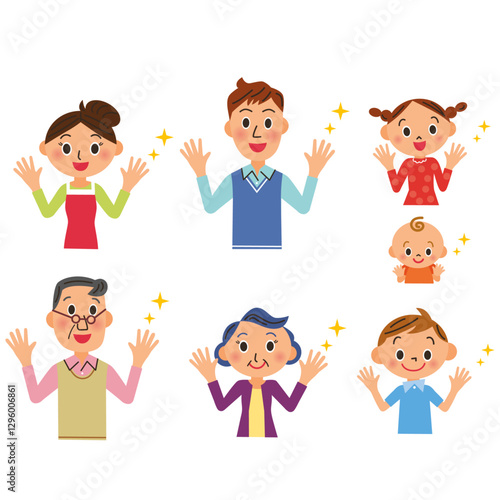 © Habu, Fototapeta premium 手を広げて手を衛生にしている上半身の三世代家族