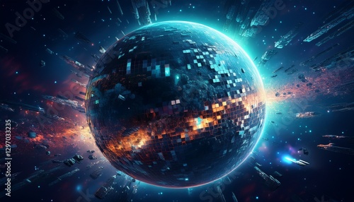 Obraz premium 거대한 행성이 픽셀처럼 해체되며 입자로 퍼지는 장면