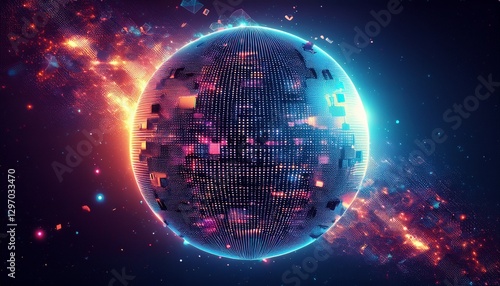 Obraz premium 거대한 행성이 픽셀처럼 해체되며 입자로 퍼지는 장면